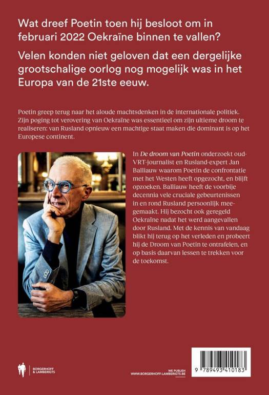 In De droom van Poetin onderzoekt oud-VRT-journalist en Rusland-expert Jan Balliauw waarom Poetin de confrontatie met het Westen heeft opgezocht. Balliauw heeft de voorbije decennia vele cruciale gebeurtenissen in en rond Rusland persoonlijk meegemaakt. Hij bezocht ook geregeld Oekraïne nadat het werd aangevallen door Rusland. Met de kennis van vandaag blikt hij terug op het verleden en probeert hij de Droom van Poetin te ontrafelen, en op basis daarvan lessen te trekken voor de toekomst.