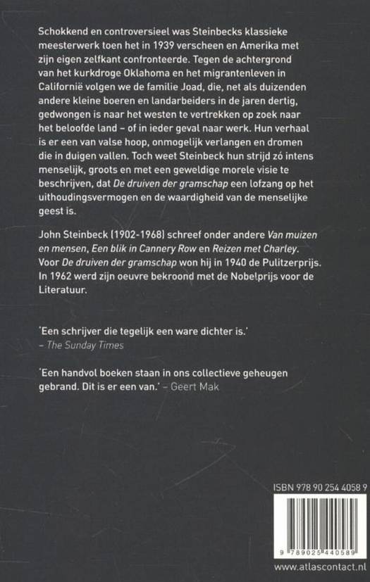 Schokkend en controversieel was Steinbecks klassieke meesterwerk toen het in 1939 verscheen en Amerika met zijn eigen zelfkant confronteerde. Tegen de achtergrond van het kurkdroge Oklahoma en het migrantenleven in Californië volgen we de familie Joad, die, net als duizenden andere kleine boeren en landarbeiders in de jaren dertig, gedwongen is naar het westen te vertrekken op zoek naar het beloofde land of in ieder geval naar werk. Hun verhaal is er een van valse hoop, onmogelijk verlangen en dromen die in duigen vallen. Toch weet Steinbeck hun strijd zó intens menselijk, groots en met een geweldige morele visie te beschrijven, dat De druiven der gramschap een lofzang op het uithoudingsvermogen en de waardigheid van de menselijke geest is.
