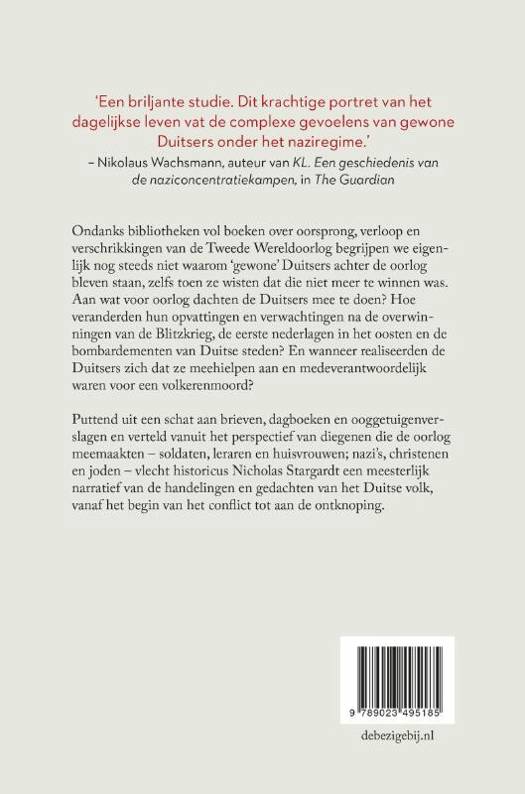 Puttend uit een schat aan brieven, dagboeken en ooggetuigenverslagen en verteld vanuit het perspectief van diegenen die de oorlog meemaakten – soldaten, leraren en huisvrouwen; nazi’s, christenen en joden – vlecht historicus Nicholas Stargardt een meesterlijk narratief van de handelingen en gedachten van het Duitse volk, vanaf het begin van het conflict tot aan de ontknoping.