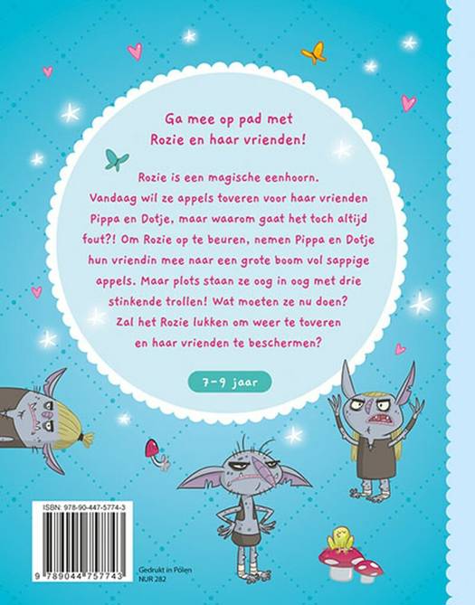 Ga mee op pad met Rozie en haar vrienden! Rozie is een magische eenhoorn. Vandaag wil ze appels toveren voor haar vrienden Pippa en Dotje, maar waarom gaat het toch altijd fout?! Om Rozie op te beuren, nemen Pippa en Dotje hun vriendin mee naar een grote boom vol sappige appels. Maar plots staan ze oog in oog met drie stinkende trollen! Wat moeten ze nu doen? Zal het Rozie lukken om weer te toveren en haar vrienden te beschermen? Voor kinderen van 7 tot 9 jaar.