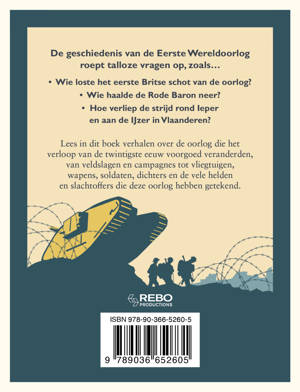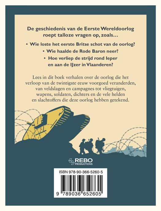 De geschiedenis van de Eerste Wereldoorlog roept talloze vragen op, zoals: wie loste het eerste Britse schot van de oorlog? Wie haalde de Rode Baron neer? Hoe verliep de strijd rond Ieper en aan de IJzer in Vlaanderen? Lees in dit boek verhalen over de oorlog die het verloop van de twintigste eeuw voorgoed veranderden, van veldslagen en campagnes tot vliegtuigen, wapens, soldaten, dichters en de vele helden en slachtoffers die deze oorlog hebben getekend.