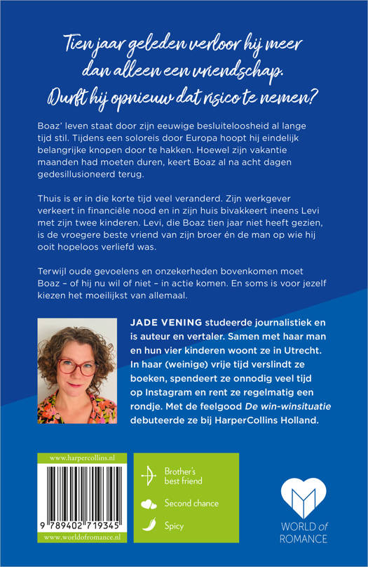 De eeuwige twijfelaar is het heerlijke en hilarische nieuwe boek van feelgoodtalent Jade Vening. Boaz' leven staat door zijn eeuwige besluiteloosheid al lange tijd stil. Tijdens een soloreis door Europa hoopt hij eindelijk belangrijke knopen door te hakken. Hoewel zijn vakantie maanden had moeten duren, keert Boaz al na acht dagen gedesillusioneerd terug. Thuis is er in die korte tijd veel veranderd. Zijn werkgever verkeert in financiële nood en in zijn huis bivakkeert ineens Levi met zijn twee kinderen. Levi, die Boaz tien jaar niet heeft gezien, is de vroegere beste vriend van zijn broer én de man op wie hij ooit hopeloos verliefd was. Terwijl oude gevoelens en onzekerheden bovenkomen moet Boaz – of hij nu wil of niet – in actie komen. En soms is voor jezelf kiezen het moeilijkst van allemaal. Lessen in de liefde is een hilarische en hartverwarmende feelgoodserie over vier vrienden, Fiona, Iris, Roos en Boaz, die allemaal iets te leren hebben over het leven én over de liefde. De eeuwige twijfelaar is het laatste deel in de serie, maar alle delen zijn ook afzonderlijk te lezen.