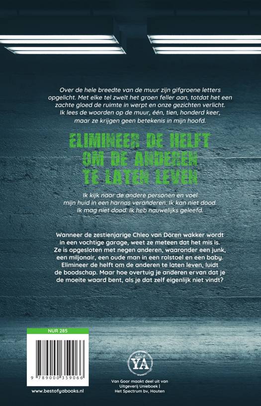Wanneer de zestienjarige Chleo van Doren wakker wordt in een vochtige garage, weet ze meteen dat het mis is. Ze is opgesloten met negen anderen, waaronder een junk, een miljonair, een oude man in een rolstoel en een baby. Elimineer de helft om de anderen te laten leven, luidt de boodschap. Maar hoe overtuig je anderen ervan dat je de moeite waard bent, als je dat zelf eigenlijk niet vindt?