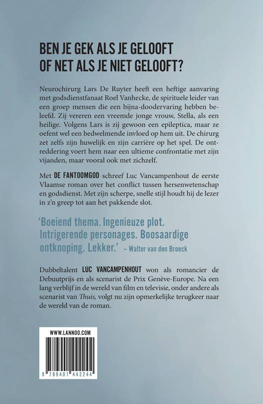 Neurochirurg Lars De Ruyter heeft een heftige aanvaring met godsdienstfanaat Roel Vanhecke, de spirituele leider van een groep mensen die een bijna-doodervaring hebben beleefd. Zij vereren een vreemde jonge vrouw, Stella, als een heilige. Volgens Lars is zij gewoon een epileptica, maar ze oefent wel een bedwelmende invloed op hem uit. De chirurg zet zelfs zijn huwelijk en zijn carrière op het spel. De ontreddering voert hem naar een ultieme confrontatie met zijn vijanden, maar vooral ook met zichzelf. Met DE FANTOOMGOD schreef Luc Vancampenhout de eerste Vlaamse roman over het conflict tussen hersenwetenschap en godsdienst. Met zijn scherpe, snelle stijl houdt hij de lezer in z'n greep tot aan het pakkende slot.