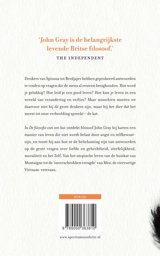 In De filosofie van een kat doet filosoof John Gray een poging om grip te krijgen op de filosofische en morele kwesties rondom de band tussen katten en mensen. In dit prachtige boek geeft Gray fascinerende voorbeelden van de complexe en intieme relatie. Hoe wij reageren op dit bijzondere 'huisdier' zegt veel over ons menselijke gedrag. Het boek is een dankbetuiging aan katten en daarnaast geeft het ons meer begrip over onze eigen dierlijke aard.