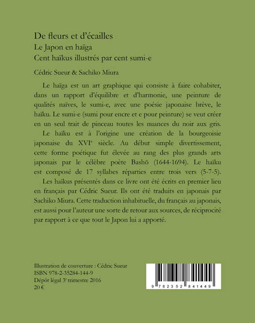 Le haïga est un art graphique qui consiste à faire cohabiter, dans un rapport d’équilibre et d’harmonie, une peinture de qualités naïves, le sumi-e, avec une poésie japonaise brève, le haïku. Le sumi-e (sumi pour encre et e pour peinture) se veut créer en un seul trait de pinceau toutes les nuances du noir aux gris. Le haïku est à l’origine une création de la bourgeoisie japonaise du XVIe siècle. Au début simple divertissement, cette forme poétique fut élevée au rang des plus grands arts japonais par le célèbre poète Bashō (1644-1694). Le haïku est composé de 17 syllabes réparties entre trois vers (5-7-5). Les haïkus présentés dans ce livre ont été écrits en français par Cédric Sueur. Ils ont été traduits en japonais par Sachiko Miura. Cette traduction i n h a b i t u e l l e , du français au japonais, est aussi pour l’auteur une sorte de retour aux sources, de réciprocité par rapport à ce que tout le Japon lui a apporté.
