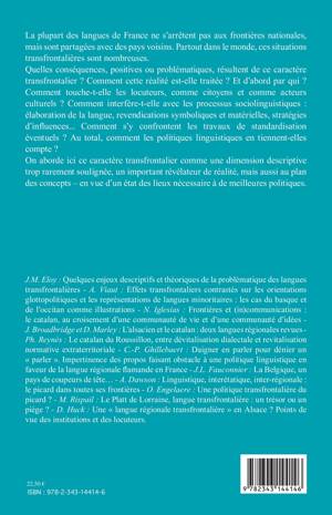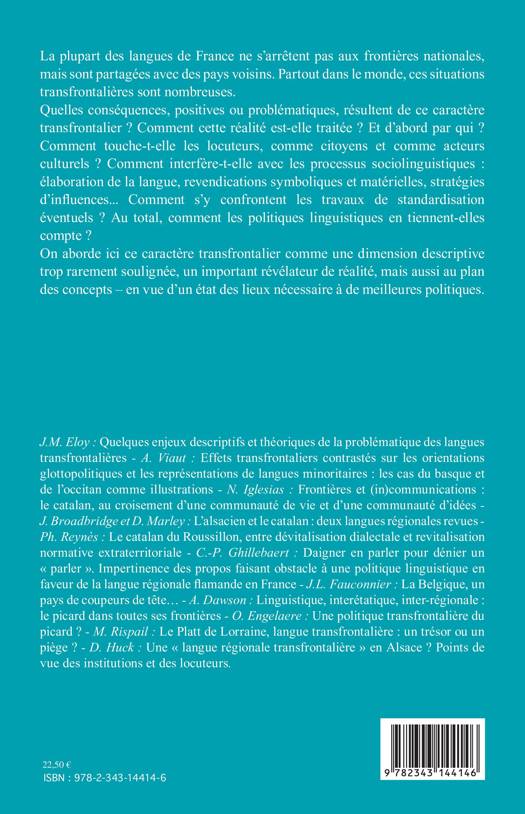 La plupart des langues de France ne s'arrêtent pas aux frontières nationales, mais sont partagées avec des pays voisins. Quelles conséquences, positives ou problématiques, résultent de ce caractère transfrontalier ? Comment cette réalité touche-t-elle les locuteurs, comme citoyens et comme acteurs culturels ? Comment interfère-t-elle avec les processus sociolinguistiques ? Comment s'y confrontent les travaux de standardisation éventuels ? Au total, comment les politiques linguistiques en tiennent-elles compte ?