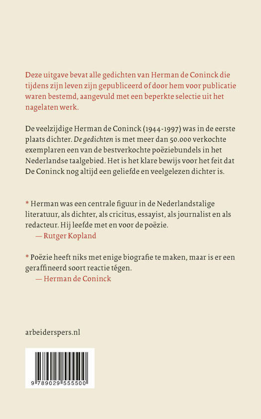 De veelzijdige Herman de Coninck (1944-1997) was in de eerste plaats dichter. De gedichten is met meer dan 50.000 verkochte exemplaren een van de bestverkochte poëziebundels in het Nederlandse taalgebied. Het is het klare bewijs voor het feit dat De Coninck nog altijd een geliefde en veelgelezen dichter is.