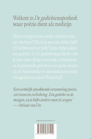 Waar vind je troost na het verliezen van een dierbare? Of als je aan een ziekte lijdt? Of liefdesverdriet hebt? Soms helpt alleen een gedicht. In De gedichtenapotheek vind je meer dan vijftig troostende, verlichtende en inspirerende gedichten van grote namen uit de Nederlandse en internationale poëzie, voorgeschreven door Philip Huff.