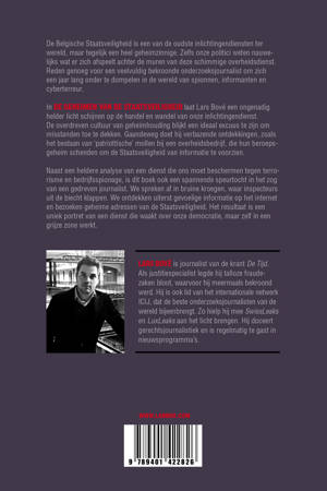 Het eerste boek dat een helder inzicht geeft in de werking van de Staatsveiligheid, boordevol nooit gepubliceerd materiaal Net nu inlichtingendiensten wereldwijd in de vuurlinie staan, doet een bekroonde onderzoeksjournalist een boekje open over de Staatsveiligheid. Belgiës meest geheime overheidsdienst heeft veel meer te verbergen dan we vermoeden. De Staatsveiligheid duldt geen pottenkijkers. Meer heeft Lars Bové niet nodig om een jaar lang op onderzoek te trekken doorheen de duistere wereld van spionnen en cyberterreur. Nooit eerder verscheen zo'n helder beeld van de overheidsdienst waarvan zelfs onze politici nauwelijks iets afweten. Bové ontrafelt de cultuur van geheimhouding en doet gaandeweg verbazende ontdekkingen. De Staatsveiligheid moet ons meer dan ooit beschermen tegen jihadisten en andere terreurdreigingen, maar vormt tegelijk een bedreiging voor zijn eigen burgers.