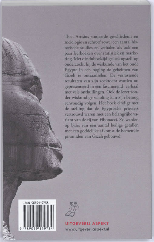 Theo Arosius studeerde geschiedenis en sociologie en schreef zowel een aantal historische studies en verhalen als ook een paar leerboeken over statistiek en marketing. Met die dubbelzijdige belangstelling onderzocht hij de wiskunde van het oude Egypte in een poging de geheimen van Gizeh te ontraadselen. De verrassende resultaten van zijn zoektocht worden nu gepresenteerd in een fascinerend verhaal met vele onthullingen. Ook de lezer zonder wiskundige scholing kan zijn betoog eenvoudig volgen. Het boek eindigt met de stelling dat de Egyptische priesters vertrouwd waren met een belangrijke variant van de rij van Fibonacci. Zo werden op basis van een aantal heilige getallen met een goddelijke afkomst de beroemde piramiden van Gizeh gebouwd.