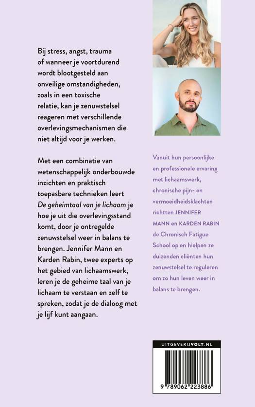 Bij stress, angst, trauma of wanneer je voortdurend wordt blootgesteld aan onveilige omstandigheden, zoals in een toxische relatie, kan je zenuwstelsel reageren met verschillende overlevingsmechanismen die niet altijd voor je werken. Met een combinatie van wetenschappelijk onderbouwde inzichten en praktisch toepasbare technieken leert De geheimtaal van je lichaam je hoe je uit die overlevingsstand komt, door je ontregelde zenuwstelsel weer in balans te brengen. Jennifer Mann en Karden Rabin, twee experts op het gebied van lichaamswerk, leren je de geheime taal van je lichaam te verstaan en zelf te spreken, zodat je de dialoog met je lijf kunt aangaan.