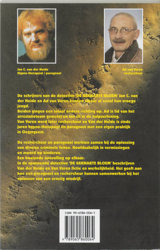 DE GEKNAKTE BLOEM Een rechercheur en paragnost werken samen bij de oplossing van diverse criminele feiten. Een boeiende aanvulling op elkaar. Hoofdzakelijk in vermissingen en moord op kinderen. In de spannende detective 'De geknakte bloem' worden fictie en werkelijkheid beschreven. Het geeft aan hoe een paragnost en rechercheur kunnen samenwerken bij het oplossen van een ernstig misdrijf.