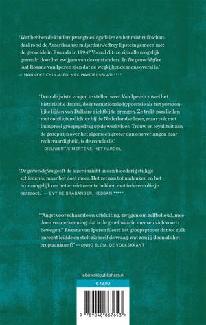 In haar ijzersterke essay De genocidefax laat Roxane van Iperen zien dat we altijd op zoek zijn naar bevestiging en aansluiting bij een groep, ook als dat betekent: liegen, zwijgen of wegkijken. In helder proza laat ze de voorgeschiedenis van de Rwandese genocide in 1994 zien, en hoe er toen niet werd ingegrepen. Naadloos trekt ze de lijn van haar betoog door naar het heden, naar ons, naar Nederland. Want bovenal is het een essay over ieder individu, en over de gecompliceerde keuze tussen je conformeren aan de groep of je uitspreken over onacceptabel gedrag, met elk risico van dien.