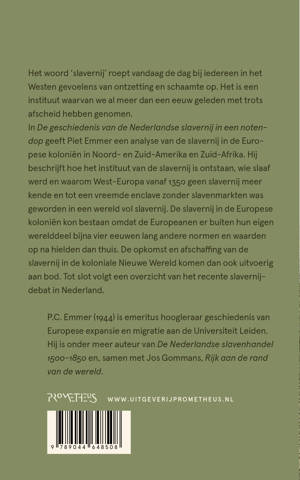 Het woord ‘slavernij’ roept vandaag de dag bij iedereen in het Westen gevoelens van ontzetting en schaamte op. Het is een instituut waarvan we al meer dan een eeuw geleden met trots afscheid hebben genomen. In De geschiedenis van de Nederlandse slavernij in een notendop geeft Piet Emmer een analyse van de slavernij in de Europese koloniën in Noord- en Zuid-Amerika en Zuid-Afrika. Hij beschrijft hoe het instituut van de slavernij is ontstaan, wie slaaf werd en waarom West-Europa vanaf 1350 geen slavernij meer kende en tot een vreemde enclave zonder slavenmarkten was geworden in een wereld vol slavernij. De slavernij in de Europese koloniën kon bestaan omdat de Europeanen er buiten hun eigen werelddeel bijna vier eeuwen lang andere normen en waarden op na hielden dan thuis. De opkomst en afschaffing van de slavernij in de koloniale Nieuwe Wereld komen dan ook uitvoerig aan bod. Tot slot volgt een overzicht van het recente slavernijdebat in Nederland.