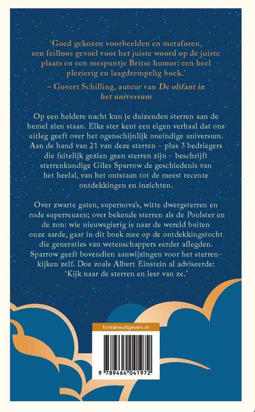 Wanneer je op een heldere nacht omhoog kijkt, kun je duizenden sterren aan de hemel zien staan. Elke ster kent een eigen verhaal dat ons uitleg geeft over het ogenschijnlijk oneindige universum. Aan de hand van 21 van deze sterren - plus 3 bedriegers die feitelijk gezien geen sterren zijn - beschrijft sterrenkundige Giles Sparrow de geschiedenis van het heelal, van het ontstaan tot de meest recente ontdekkingen en inzichten.