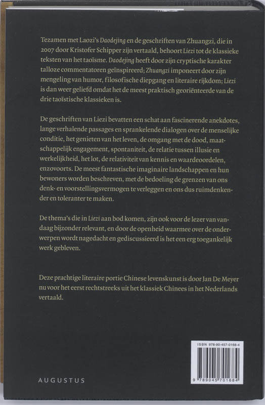 Het boek Liezi hoort thuis in de traditie van het taoïsme, waar het schouder aan schouder staat met de twee andere grote klassieke werken: Laozi's Daodejing en de geschriften van Zhuangzi, die in 2007 door Kristofer Schipper voor Augustus werden vertaald. Traditioneel werd Liezi 'Meester Lie' toegeschreven aan de kluizenaar Lie Yukou, die rond 400 v. Chr. zou hebben geleefd. De geschriften van Liezi, die terecht worden beschouwd als de meest praktisch georiënteerde onder de drie taoïstische klassieken, bevatten een schat aan fascinerende anekdotes en sprankelende dialogen over de menselijke conditie, het genieten van het leven, de omgang met de dood, maatschappelijk engagement, spontaniteit, de relatie tussen illusie en werkelijkheid, het lot, de relativiteit van kennis en waardeoordelen, enzovoort. De thema's die in Liezi aan bod komen, zijn ook voor de lezer van vandaag bijzonder relevant, en door de openheid waarmee over de onderwerpen wordt nagedacht en gediscussieerd is het een erg toegankelijk werk gebleven. Deze prachtige literaire portie Chinese levenskunst is door Jan De Meyer nu voor het eerst rechtstreeks uit het klassiek Chinees in het Nederlands vertaald.