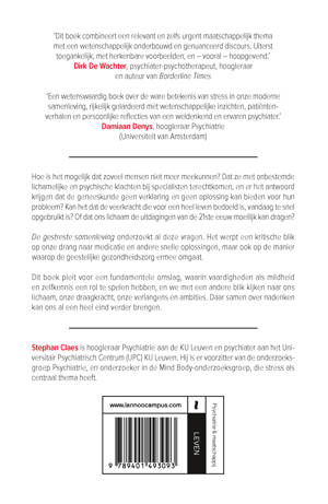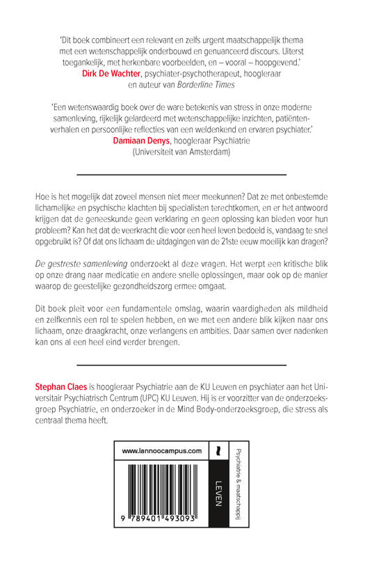 'Dit boek combineert een relevant en zelfs urgent maatschappelijk thema met een wetenschappelijk onderbouwd en genuanceerd discours. Uiterst toegankelijk, met herkenbare voorbeelden, en - vooral - hoopgevend.' - Dirk De Wachter, psychiater-psychotherapeut, hoogleraar en auteur 'Een wetenswaardig boek over de ware betekenis van stress in onze moderne samenleving, rijkelijk gelardeerd met wetenschappelijke inzichten, patiëntenverhalen en persoonlijke reflecties van een weldenkend en ervaren psychiater.' - Damiaan Denys, hoogleraar Psychiatrie (Universiteit van Amsterdam)