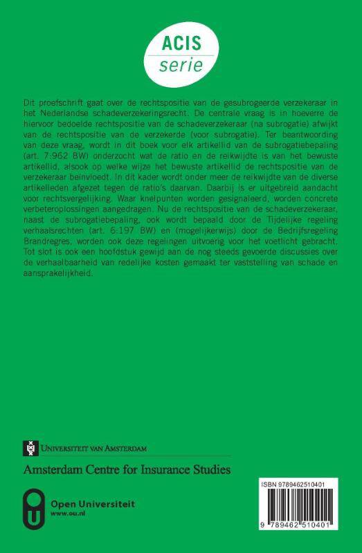 Dit proefschrift gaat over de rechtspositie van de gesubrogeerde verzekeraar in het Nederlandse schadeverzekeringsrecht. De centrale vraag is in hoeverre de hiervoor bedoelde rechtspositie van de schadeverzekeraar (na subrogatie) afwijkt van de rechtspositie van de verzekerde (voor subrogatie). Ter beantwoording van deze vraag, wordt in dit boek voor elk artikellid van de subrogatiebepaling (art. 7:962 BW) onderzocht wat de ratio en de reikwijdte is van het bewuste artikellid, alsook op welke wijze het bewuste artikellid de rechtspositie van de verzekeraar beïnvloedt. In dit kader wordt onder meer de reikwijdte van de diverse artikelleden afgezet tegen de ratio's daarvan. Daarbij is er uitgebreid aandacht voor rechtsvergelijking. Waar knelpunten worden gesignaleerd, worden concrete verbeteroplossingen aangedragen. Nu de rechtspositie van de schadeverzekeraar, naast de subrogatiebepaling, ook wordt bepaald door de Tijdelijke regeling verhaalsrechten (art. 6:197 BW) en (mogelijkerwijs) door de Bedrijfsregeling Brandregres, worden ook deze regelingen uitvoerig voor het voetlicht gebracht. Tot slot is ook een hoofdstuk gewijd aan de nog steeds gevoerde discussies over de verhaalbaarheid van redelijke kosten gemaakt ter vaststelling van schade en aansprakelijkheid.