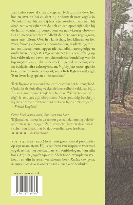 ‘De geur van het bos’ is een lofzang op het veldwerk, al een halve eeuw struint vogelaar Rob Bijlsma door het bos en over de hei en doet hij onderzoek naar vogels in Nederland en Afrika. Tijdens zijn zwerftochten heeft hij altijd een verrekijker om de nek en een opschrijfboekje bij de hand, waarin hij consequent en nauwkeurig observaties en metingen noteert. Allicht dat deze over vogels gaan, maar niet alleen. Ook het landschap, het klimaat en het weer, fenologie, bomen en boomtoppen, zaadzetting, muizen en insecten ontsnappen niet aan zijn nieuwsgierige en onderzoekende geest. ‘De geur van het bos’ bevat een thematische bundeling van de bijvangsten van al dat onderzoek, ingebed in ecologische en evolutionaire achtergronden. Vijftig jaar meeslepende beschrijvende wetenschap, of, zoals Rob Bijlsma zelf zegt: ‘Een leven lang spelen in de zandbak.’