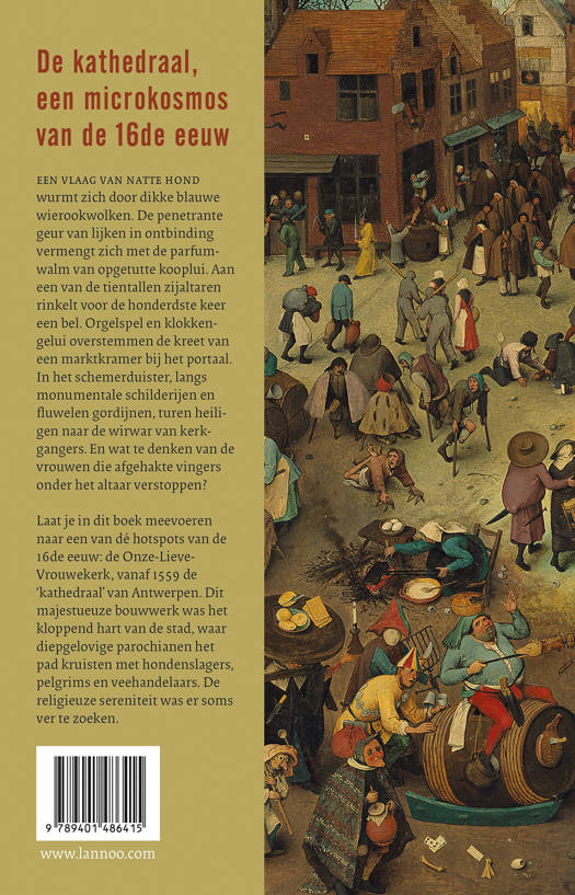 Een vlaag van natte hond wurmt zich door dikke blauwe wierookwolken in de Onze-Lieve-Vrouwekerk. De penetrante geur van lijken in ontbinding vermengt zich met de parfumwalm van opgetutte kooplui. Aan een van de tientallen zijaltaren rinkelt voor de honderdste keer een bel. Orgelspel en klokkengelui overstemmen de kreet van een marktkramer bij het portaal. In het schemerduister, langs monumentale schilderijen en fluwelen gordijnen, turen heiligen naar de wirwar van kerkgangers. En wat te denken van de vrouwen die afgehakte vingers onder het altaar verstoppen? Laat je in dit boek meevoeren naar een van dé hotspots van de 16de eeuw: de Onze-Lieve-Vrouwekerk, vanaf 1559 de 'kathedraal' van Antwerpen. Dit majestueuze bouwwerk was het kloppend hart van de stad, waar diepgelovige parochianen het pad kruisten met hondenslagers, pelgrims en veehandelaars. De religieuze sereniteit was er soms ver te zoeken.