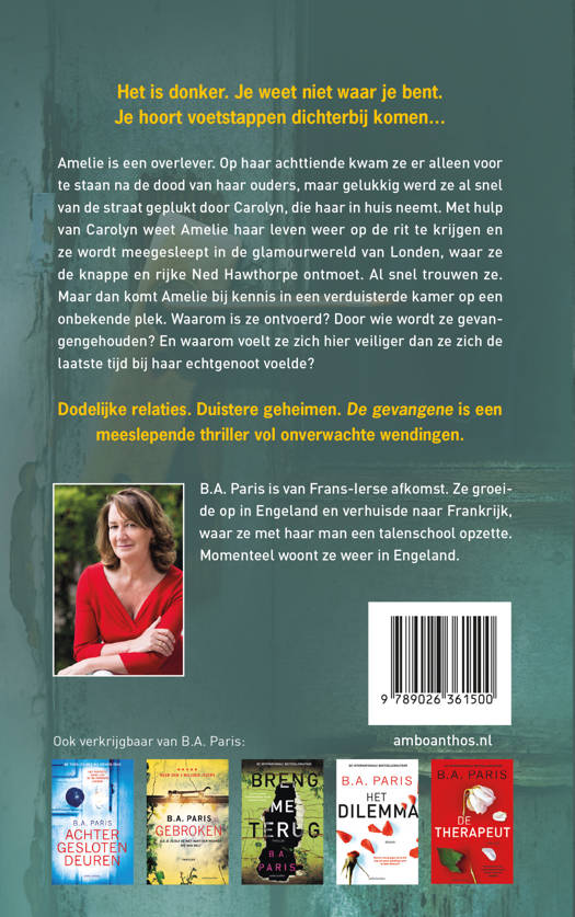 Amelie is een overlever. Op haar achttiende kwam ze er alleen voor te staan na de dood van haar ouders, maar gelukkig werd ze al snel van de straat geplukt door Carolyn, die haar in huis neemt. Met hulp van Carolyn weet Amelie haar leven weer op de rit te krijgen en ze wordt meegesleept in de glamourwereld van Londen, waar ze de knappe en rijke Ned Hawthorpe ontmoet. Al snel trouwen ze. Maar dan komt Amelie bij kennis in een verduisterde kamer op een onbekende plek. Waarom is ze ontvoerd? Door wie wordt ze gevangengehouden? En waarom voelt ze zich hier veiliger dan ze zich de laatste tijd bij haar echtgenoot voelde?