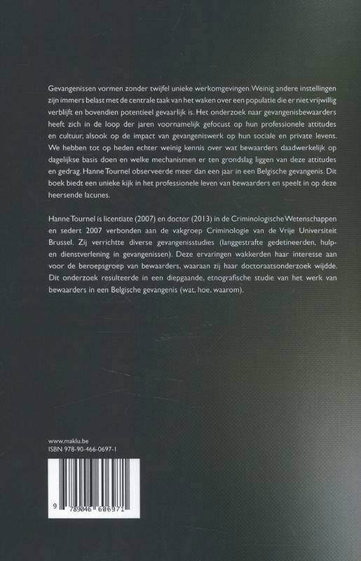 Gevangenissen vormen zonder twijfel unieke werkomgevingen. Weinig andere instellingen zijn immers belast met de centrale taak van het waken over een populatie die er niet vrijwillig verblijft en bovendien potentieel gevaarlijk is. Het onderzoek naar gevangenisbewaarders heeft zich in de loop der jaren voornamelijk gefocust op hun professionele attitudes en cultuur, alsook op de impact van gevangeniswerk op hun sociale en private levens. We hebben tot op heden echter weinig kennis over wat bewaarders daadwerkelijk op dagelijkse basis doen en welke mechanismen er ten grondslag liggen van deze attitudes en gedrag. Hanne Tournel observeerde meer dan een jaar in een Belgische gevangenis. Dit boek biedt een unieke kijk in het professionele leven van bewaarders en speelt in op deze heersende lacunes.