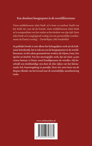 ‘Geen middeleeuwse tekst biedt zo’n bont en tastbaar beeld van het Italië uit 1300 als de Komedie. Geen middeleeuwse tekst biedt zo’n compendium van het voelen en het denken van zijn tijd. Geen tekst biedt zo’n aangrijpend verslag van een persoonlijke transformatie als Dante's verslag.’ David Rijser, NRC Handelsblad