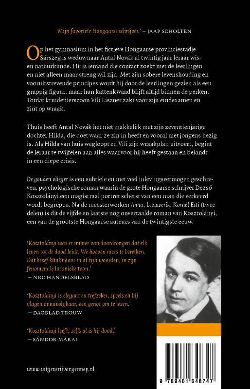 DE GOUDEN VLIEGER is een subtiele en met veel inlevingsvermogen geschreven, psychologische roman waarin de grote Hongaarse schrijver Dezso " Kosztolányi een magistraal portret schetst van een man die verkeerd wordt begrepen. Na de meesterwerken Anna, Leeuwerik, Kornél Esti (twee delen) is dit de vijfde en laatste nog onvertaalde roman van Kosztolányi, een van de grootste Hongaarse auteurs van de twintigste eeuw.
