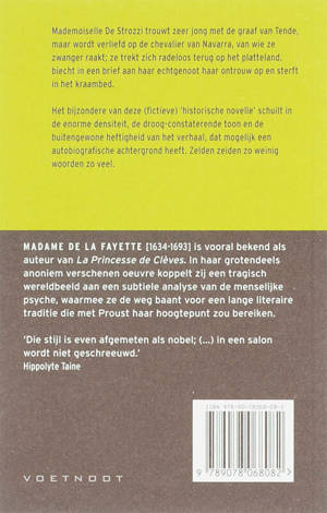 Mademoiselle De Strozzi trouwt zeer jong met de graaf van Tende, maar wordt verliefd op de chevalier van Navarra, van wie ze zwanger raakt; ze trekt zich radeloos terug op het platteland, biecht in een brief aan haar echtgenoot haar ontrouw op en sterft in het kraambed. Het bijzondere van deze (fictieve) 'historische novelle' schuilt in de enorme densiteit, de droog-constaterende toon en de buitengewone heftigheid van het verhaal, dat mogelijk een autobiografische achtergrond heeft. Zelden zeiden zo weinig woorden zo veel. MADAME DE LA FAYETTE [1634-1693] is vooral bekend als auteur van La Princesse de Clèves. In haar grotendeels anoniem verschenen oeuvre koppelt zij een tragisch wereldbeeld aan een subtiele analyse van de menselijke psyche, waarmee ze de weg baant voor een lange literaire traditie die met Proust haar hoogtepunt zou bereiken. 'Die stijl is even afgemeten als nobel; (...) in een salon wordt niet geschreeuwd.' Hippolyte Taine