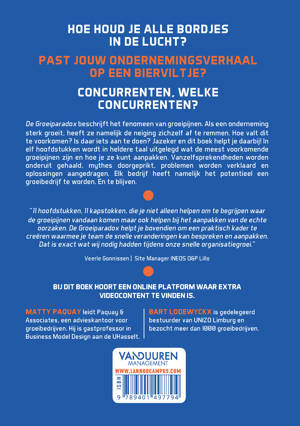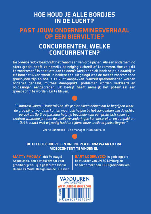 De Groeiparadox beschrijft het fenomeen van groeipijnen. Als een onderneming sterk groeit, heeft ze namelijk de neiging zichzelf af te remmen. Hoe valt dit te voorkomen? Is daar iets aan te doen? Jazeker en dit boek helpt je daarbij! In elf hoofdstukken wordt in heldere taal uitgelegd wat de meest voorkomende groeipijnen zijn en hoe je ze kunt aanpakken. Vanzelfsprekendheden worden onderuit gehaald, mythes doorgeprikt, problemen worden verklaard en oplossingen aangedragen. Elk bedrijf heeft namelijk het potentieel een groeibedrijf te worden. En te blijven.