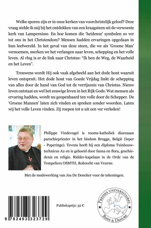 Welke sporen zijn er in onze kerken van voorchristelijk geloof? Deze vraag stelde ik mij bij het ontdekken van een kraagsteen uit de verwoeste kerk van Lampernisse. En hoe komen die ‘heidense’ symbolen zo ver tot ons in het Christendom? Mensen hadden ervaringen opgedaan in hun leefwereld. In het geval van deze steen, die we als ‘Groene Man’ vernoemen, merken we het verlangen naar leven, schepping en het volle leven. Al vlug is er de link naar Christus: “Ik ben de Weg, de Waarheid en het Levenˮ. Trouwens wordt Hij ook vaak afgebeeld aan het dode hout waaruit leven ontspruit. Het dode hout van Goede Vrijdag linkt de schepping van alles door de hand van God tot de verrijzenis van Christus. Nieuw leven ontstaat en wel het eeuwige leven in het Rijk Gods. Wat mensen als ervaring hadden, wordt nu geopenbaard ten volle door de Schepper. De ‘Groene Mannenʼ laten zich vinden en spreken zonder woorden. Laten wij het volle Leven vinden. Zij roepen tot u uit een ver verleden!