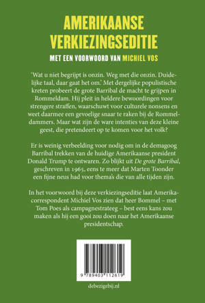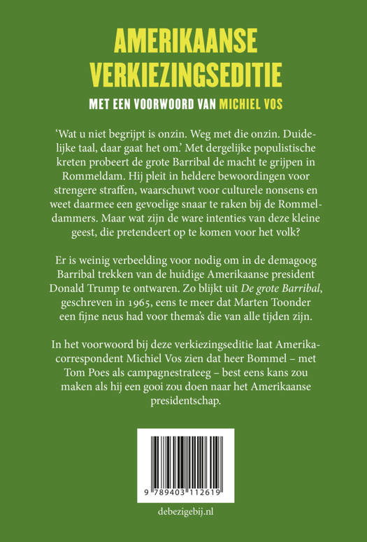 ‘Wat u niet begrijpt is onzin. Weg met die onzin. Duidelijke taal, daar gaat het om.’ Met dergelijke populistische kreten probeert de grote Barribal het volk te bespelen en de macht te grijpen in Rommeldam. Hij pleit voor strengere straffen, eenvoudige, klare taal en waarschuwt voor culturele onzin. Dat hij in werkelijkheid een dwerg is met een minderwaardigheidscomplex weet hij lang verborgen te houden, tot hij ontmaskerd wordt met dank aan Tom Poes. De grote Barribal – geschreven in 1965 – is andermaal een Bommel-verhaal waarin Marten Toonder een universeel en tijdloos thema wist te verpakken. In het Witte Huis zetelt al vier jaar een president die qua manipulaties en trucs niet onderdoet voor de grote Barribal. Hoog tijd daarom, in aanloop naar de Amerikaanse presidentsverkiezingen, voor een speciale Trump-editie.