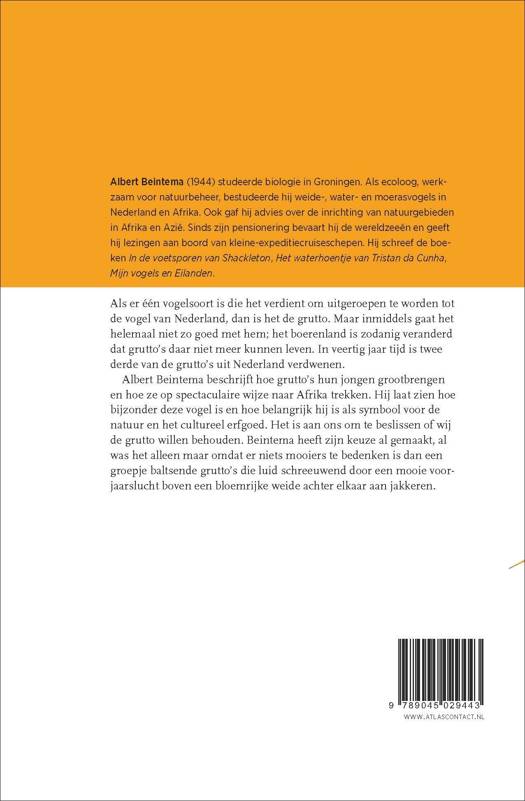 Als er één vogelsoort is die het verdient om uitgeroepen te worden tot de vogel van Nederland, dan is het de grutto. Maar inmiddels gaat het helemaal niet zo goed met hem; het boerenland is zodanig veranderd dat grutto's daar niet meer kunnen leven. In veertig jaar tijd is twee derde van de grutto's uit Nederland verdwenen. Albert Beintema beschrijft hoe grutto's hun jongen grootbrengen en hoe ze op spectaculaire wijze naar Afrika trekken. Hij laat zien hoe bijzonder deze vogel is en hoe belangrijk hij is als symbool voor de natuur en het cultureel erfgoed. Het is aan ons om te beslissen of wij de grutto willen behouden. Beintema heeft zijn keuze al gemaakt, al was het alleen maar omdat er niets mooiers te bedenken is dan een groepje baltsende grutto's die luid schreeuwend door een mooie voorjaarslucht boven een bloemrijke weide achter elkaar aan jakkeren.