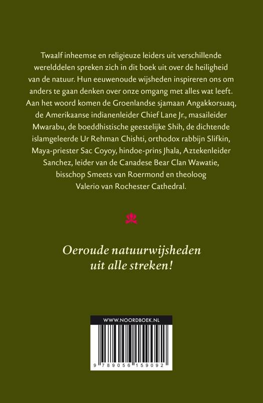 Twaalf inheemse en religieuze leiders uit verschillende werelddelen spreken zich in dit boek uit over de heiligheid van de natuur. Hun eeuwenoude wijsheden inspireren ons om anders te gaan denken over onze omgang met alles wat leeft. Aan het woord komen de Groenlandse sjamaan Angakkorsuaq, de Amerikaanse indianenleider Chief Lane Jr., masaileider Mwarabu, de boeddhistische geestelijke Shih, de dichtende islamgeleerde Ur Rehman Chishti, orthodox rabbijn Slifkin, Maya-priester Sac Coyoy, hindoe-prins Jhala, Aztekenleider Sanchez, leider van de Canadese Bear Clan Wawatie, bisschop Smeets van Roermond en theoloog Valerio van Rochester Cathedral.
