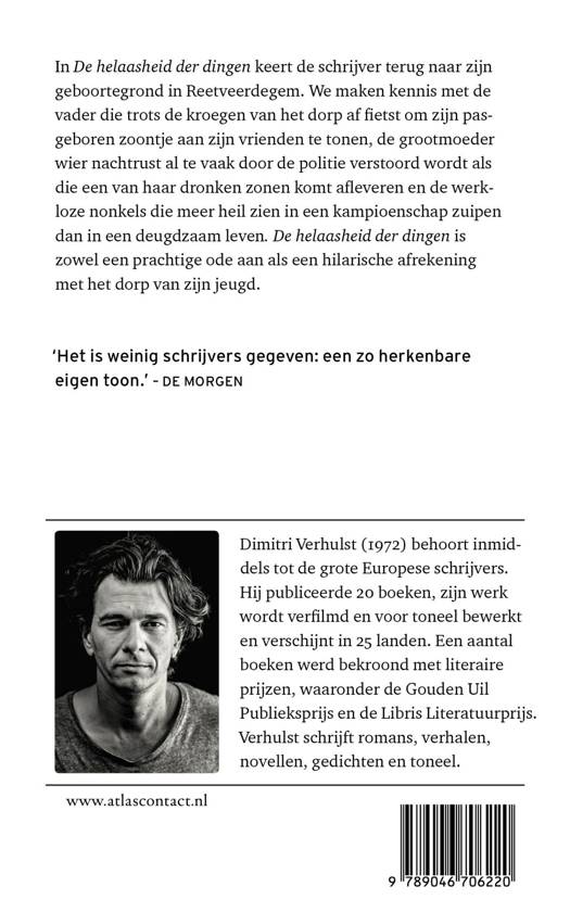 In 'De helaasheid der dingen' keert een schrijver terug naar zijn geboortegrond in Reetveerdegem. Het is zowel een gevoelige ode aan als een hilarische afrekening met het dorp van zijn jeugd. We maken kennis met zijn vader, Pierre, die zijn paar uur oude zoontje in een postzak op zijn fiets langs alle kroegen van het dorp rijdt om hem aan zijn vrienden te tonen; zijn grootmoeder, wier nachtrust al te vaak verstoord wordt door de politie als die weer eens een van haar dronken zonen thuis komt afleveren; en niet te vergeten de werkloze nonkels Potrel, Herman en Zwaren, voor wie een wereldkampioenschap zuipen het hoogst haalbare is en die leven volgens het adagium 'God schiep de dag en wij slepen ons erdoorheen'.