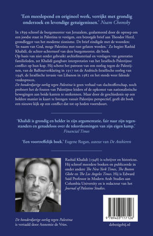 In 1899 schreef de burgemeester van Jeruzalem, gealarmeerd door de oproep om een joodse staat in Palestina te vestigen, een bezorgde brief aan Theodor Herzl, grondlegger van het moderne zionisme. De brief eindigde met de woorden: ‘In naam van God, moge Palestina met rust gelaten worden.’ Zo begint Rashid Khalidi, de achter-achterneef van deze burgemeester, dit boek.
