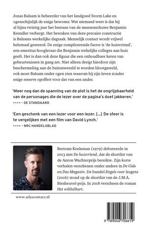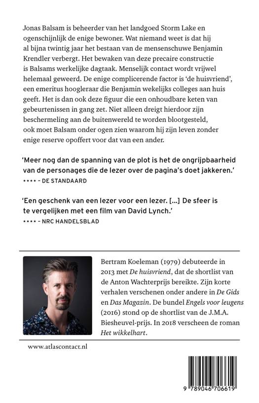 In 'De huisvriend' van Bertram Koeleman is Jonas Balsam beheerder van het landgoed Storm Lake en ogenschijnlijk de enige bewoner. Wat niemand weet is dat hij al bijna twintig jaar het bestaan van de mensenschuwe Benjamin Krendler verbergt. Het bewaken van deze precaire constructie is Balsams werkelijke dagtaak. Menselijk contact wordt vrijwel helemaal geweerd. De enige complicerende factor is 'de huisvriend', een emeritus hoogleraar die Benjamin wekelijks colleges aan huis geeft. Het is dan ook deze figuur die een onhoudbare keten van gebeurtenissen in gang zet. Niet alleen dreigt hierdoor zijn beschermeling aan de buitenwereld te worden blootgesteld, ook moet Balsam onder ogen zien waarom hij zijn leven zonder enige reserve opoffert voor dat van een ander.