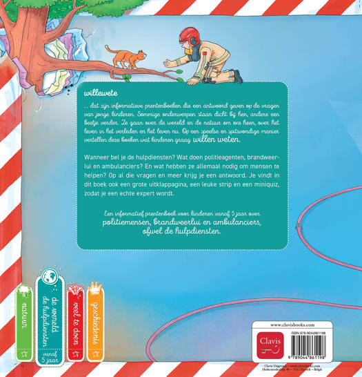 willewete … dat zijn informatieve prentenboeken die een antwoord geven op de vragen van jonge kinderen. Sommige onderwerpen staan dicht bij hen, andere een beetje verder. Ze gaan over de hele wereld en de natuur om ons heen, over het leven in het verleden en het leven nu. Op een speelse en spitsvondige manier vertellen deze boeken wat kinderen graag willen weten. Wanneer bel je de hulpdiensten? Wat doen politieagenten, brandweerlui en ambulanciers? En wat hebben ze allemaal nodig om mensen te helpen? Op al die vragen en meer krijg je een antwoord. Je vindt in dit boek ook een grote uitklappagina, een leuke strip en een miniquiz, zodat je een echte expert wordt.