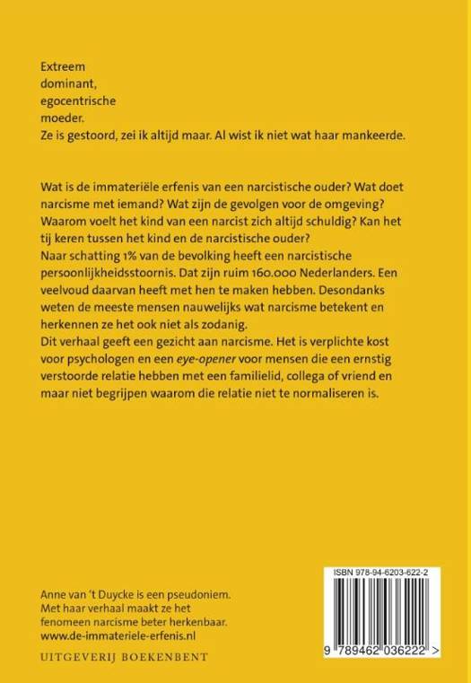 Wat is de immateriële erfenis van een narcistische ouder? Wat doet narcisme met iemand? Wat zijn de gevolgen voor de omgeving? Waarom voelt het kind van een narcist zich altijd schuldig? Kan het tij keren tussen het kind en de narcistische ouder? Naar schatting 1% van de bevolking heeft een narcistische persoonlijkheidsstoornis. Dat zijn ruim 160.000 Nederlanders. Een veelvoud daarvan heeft met hen te maken hebben. Desondanks weten de meeste mensen nauwelijks wat narcisme betekent en herkennen ze het ook niet als zodanig. Dit verhaal geeft een gezicht aan narcisme. Het is verplichte kost voor psychologen en een eye-opener voor mensen die een ernstig verstoorde relatie hebben met een familielid, collega of vriend en maar niet begrijpen waarom die relatie niet te normaliseren is.