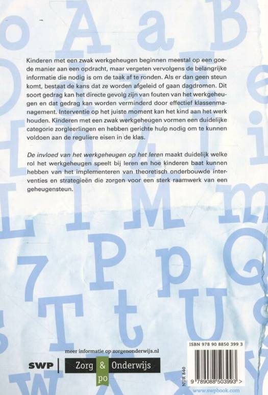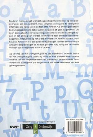 Deze toegankelijke gids stelt basisschoolleerkrachten, speciaal onderwijsleerkrachten, onderwijsassistenten, logopedisten, remedial teachers, orthopedagogen in staat te begrijpen hoe het werkgeheugen functioneert en hoe het in leersituaties ondersteund kan worden. De auteurs hebben door onderzoek aangetoond dat een zwak werkgeheugen leidt tot leerproblemen bij bijvoorbeeld kernvakken als taal en rekenen. De capaciteit van het werkgeheugen is doorslaggevend voor het leveren van goeie leerprestaties. Door het observeren van kinderen met een zwak werkgeheugen tijdens hun dagelijkse bezigheden in de klas werd duidelijk dat hun frustraties, mislukkingen en gemiste leermomenten naar voren komen als ze bezig zijn met activiteiten die het geheugen te zwaar belasten. Problemen met het werkgeheugen op school worden vaak niet opgemerkt, of worden geduid als een gebrek aan concentratie (zoals 'luistert niet' of 'snel afgeleid') of als gebrek aan motivatie ('heeft geen belangstelling'). Kinderen met een zwak werkgeheugen beginnen meestal op een goede manier aan een opdracht, maar vergeten vervolgens de belangrijke informatie die nodig is om de taak af te ronden; als er dan geen steun komt, bestaat wel de kans dat ze worden afgeleid of gaan dagdromen. Dit soort gedrag kan het directe gevolg zijn van fouten van het werkgeheugen en dat gedrag kan worden verminderd door effectief klassenmanagement. Interventie op het juiste moment kan het kind aan het werk houden. Kinderen met een zwak werkgeheugen vormen een duidelijke categorie zorgleerlingen en hebben gerichte hulp nodig om te kunnen voldoen aan de reguliere eisen in de klas. Bij onderzoek naar ontwikkelingsstoornissen op leergebieden is het vrij algemeen om problemen van het werkgeheugen te beschouwen als bijverschijnsel van een van de bekende problemen als dyslexie, taalstoornissen of ADHD. In geen van deze gevallen is een zwak werkgeheugen een criterium voor de diagnostisering, hoewel de combinatie wel vaak voorkomt. Een zwak werkgeheugen komt zeker even vaak voor als de boven genoemde stoornissen. Dit boek maakt duidelijk welke rol het werkgeheugen speelt bij leren en hoe kinderen baat kunnen hebben van het implementeren van theoretisch onderbouwde interventies en strategieën die zorgen voor een sterk raamwerk van geheugensteun.