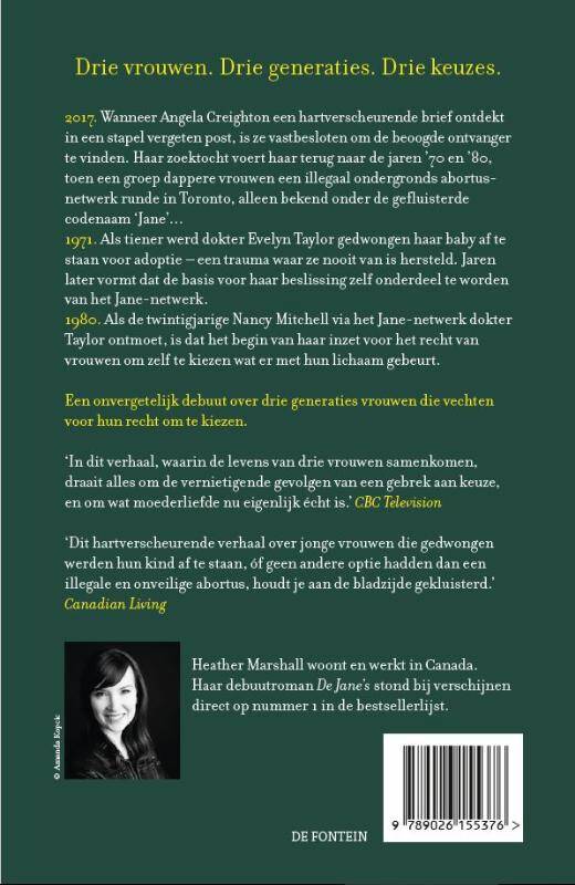 2017. Wanneer Angela Creighton een hartverscheurende brief ontdekt in een stapel vergeten post, is ze vastbesloten om de beoogde ontvanger te vinden. Haar zoektocht voert haar terug naar de jaren ’70 en ’80, toen een groep dappere vrouwen een illegaal ondergronds abortusnetwerk runde in Toronto, alleen bekend onder de gefluisterde codenaam ‘Jane’…