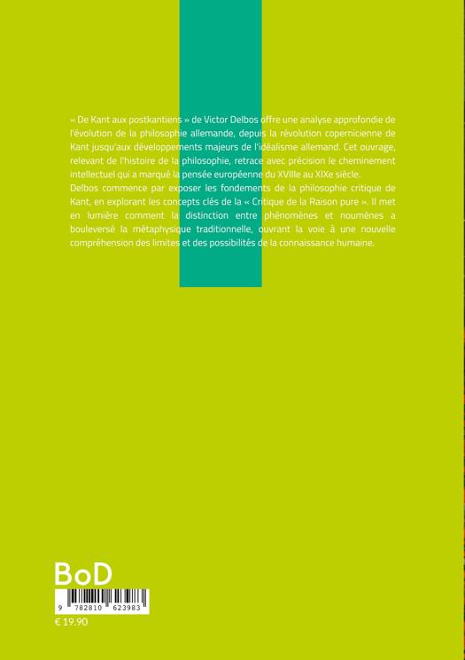 « De Kant aux postkantiens » de Victor Delbos offre une analyse approfondie de l'évolution de la philosophie allemande, depuis la révolution copernicienne de Kant jusqu'aux développements majeurs de l'idéalisme allemand. Cet ouvrage, relevant de l'histoire de la philosophie, retrace avec précision le cheminement intellectuel qui a marqué la pensée européenne du XVIIIe au XIXe siècle. Delbos commence par exposer les fondements de la philosophie critique de Kant, en explorant les concepts clés de la « Critique de la Raison pure ». Il met en lumière comment la distinction entre phénomènes et noumènes a bouleversé la métaphysique traditionnelle, ouvrant la voie à une nouvelle compréhension des limites et des possibilités de la connaissance humaine. L'auteur s'attache ensuite à démontrer comment les successeurs de Kant ont interprété, critiqué et développé sa pensée. Il examine en détail les contributions de figures majeures telles que Fichte, Schelling et Hegel, qui ont cherché à dépasser les limites du kantisme tout en conservant ses intuitions fondamentales. Delbos met en évidence la manière dont ces penseurs ont progressivement élaboré des systèmes philosophiques visant à réconcilier le sujet et l'objet, la liberté et la nature, dans une vision totalisante de la réalité. Dans une perspective relevant de l'épistémologie, l'ouvrage explore également les implications de ces développements pour la théorie de la connaissance. Delbos montre comment le postkantisme a tenté de résoudre les problèmes laissés en suspens par Kant, notamment la question de la chose en soi et le statut de la connaissance a priori. Enfin, l'auteur aborde les aspects éthiques et politiques de cette évolution philosophique, soulignant l'importance croissante accordée à l'histoire et à la réalisation de la liberté dans le monde concret. Il met en lumière les liens entre ces théories philosophiques et les transformations sociales et politiques de l'époque, offrant ainsi une réflexion pertinente sur les rapports entre pensée et action. « De Kant aux postkantiens » reste une oeuvre de référence pour comprendre les fondements de la philosophie moderne et son influence durable sur la pensée contemporaine. Son analyse rigoureuse et sa clarté d'exposition en font un ouvrage essentiel pour les étudiants en philosophie et les chercheurs intéressés par l'histoire des idées.