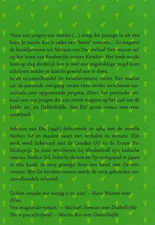 In De karakterromans vormt het nooit eerder in de handel gebrachte verhaal 'Een waarze sat' de passende overgang tussen twee eerder verschenen boeken van Van Dis over opgroeiende jongens: Zilver, het poëtische verhaal over een jongen die zijn eerste stappen op het pad van de liefde zet, en Dubbelliefde, de niets verhullende ontwikkelingsroman over een student op zoek naar onfatsoen en lust, Van Dis' grote roman over eenzaamheid. 'Zelden smaakt wat wrang is zo zoet.' Hans Warren over Zilver