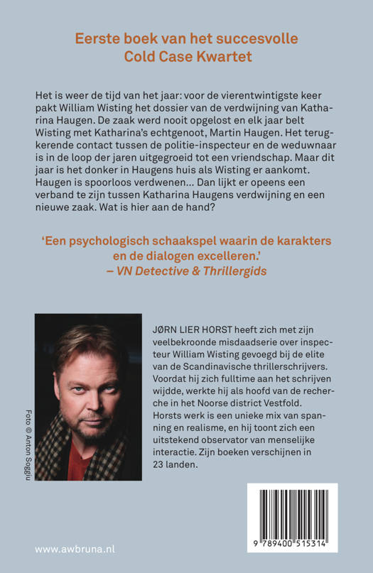 Het is weer de tijd van het jaar: voor de vierentwintigste keer pakt William Wisting het dossier van de verdwijning van Katharina Haugen. De zaak werd nooit opgelost en elke jaar belt Wisting met Katharina’s echtgenoot, Martin Haugen. Het terugkerende contact tussen de politieinspecteur en de weduwnaar is in de loop der jaren uitgegroeid tot een vriendschap. Maar dit jaar is het donker in Haugens huis als Wisting er aankomt. Haugen is spoorloos verdwenen.