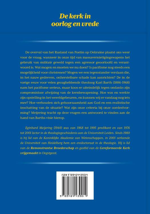 De overval van het Rusland van Poetin op Oekraïne plaatst ons weer voor de vraag, wanneer in onze tijd van massavernietigingswapens het gebruik van militair geweld tegen een agressor geoorloofd en verantwoord is. Wat mogen en moeten we nu doen? Is pacifisme nog steeds een mogelijkheid voor christenen? Mogen we een tegenstander verslaan die, in het nauw gedreven, onherstelbare schade kan aanrichten? De in de vorige eeuw voor velen gezaghebbende theoloog Karl Barth (1886-1968) nam het pacifisme serieus, maar koos er uiteindelijk tegen ondanks zijn compromisloze afwijzing van de kernbewapening. Hoe was en werkte zijn opstelling in het wereldgebeuren, en kunnen wij er vandaag nog iets mee? Hoe verhouden zich gehoorzaamheid aan God en een realistische inschatting van de situatie? Wat zijn onze criteria bij onze oordeelvorming? Meijering tracht op deze vragen een antwoord te vinden aan de hand van Barths visie hierop.