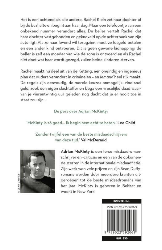 ‘Je hebt nog nooit iets zoals De Ketting gelezen en je zult het nooit vergeten. Briljant. Fantastisch geschreven. Meesterlijk spannend. Dit is Jaws voor ouders.’ Don Winslow‘Met afstand een van de beste misdaadschrijvers van deze tijd.’ Val McDermidHet is een ochtend als alle andere. Rachel Klein zet haar dochter af bij de bushalte en begint aan haar dag. Maar een telefoontje van een onbekend nummer verandert alles. De beller vertelt Rachel dat haar dochter vastgebonden en gekneveld op de achterbank van zijn auto ligt. Als ze haar ooit weer wil zien, moet ze losgeld betalen en een ander kind ontvoeren. Dit is geen gewone kidnapping: de beller is zelf een moeder wier zoon is ontvoerd en als Rachel niet doet wat haar wordt gezegd, zullen beide kinderen sterven.Rachel maakt nu deel uit van de Ketting, een oneindig en ingenieus plan dat ouders verandert in criminelen – en iemand heel rijk maakt. De regels zijn eenvoudig, de morele keuzes onmogelijk: vind snel geld, zoek een eigen slachtoffer en bega een vreselijke daad waarvan je 24 uur geleden nog dacht dat je er nooit toe in staat zou zijn.De genieën achter de Ketting weten dat ouders alles voor hun kinderen overhebben. Wat ze niet weten is dat zelfs de sterkste ketting maar zoveel druk kan verdragen... tot hij breekt.Auteurs over Adrian McKinty