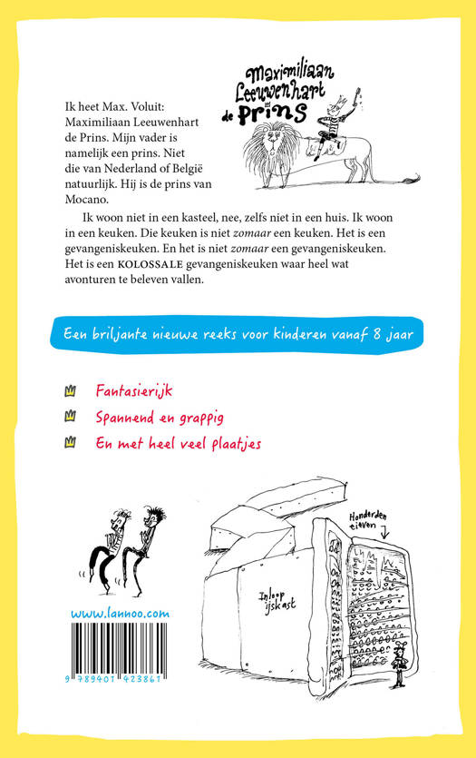 Een briljante nieuwe reeks voor fans van 'De waanzinnige boomhut' Ik heet Max. Voluit: Maximiliaan Leeuwenhart de Prins. Mijn vader is namelijk een prins. Niet die van Nederland of België natuurlijk. Hij is de prins van Mocano. Ik woon niet in een kasteel, nee, zelfs niet in een huis. Ik woon in een keuken. Die keuken is niet zomaar een keuken. Het is een gevangenis keuken. En het is niet zomaar een gevangeniskeuken. Het is een KOLOSSALE gevangeniskeuken waar heel wat avonturen te beleven vallen. Een briljante nieuwe reeks voor kinderen vanaf 8 jaar. Fantasierijk, spannend, en met heel veel plaatjes.