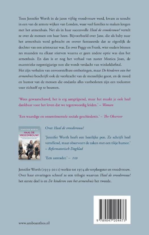 Jennifer Worth (in de tv-serie `Call the Midwife Jenny Lee), die in de jaren vijftig vroedvrouw was in de East End van Londen, vertelt in dit vervolg op `Haal de vroedvrouw! nog meer verhalen over de mensen met wie ze te maken kreeg. Zoals Peggy en Frank, wier ouders binnen zes maanden na elkaar stierven waarna er geen andere optie was dan het armenhuis. En zuster Monica Joan, de excentrieke oude non die wordt verdacht van winkeldiefstal. Het zijn verhalen van onvoorstelbare ontberingen, maar `De kinderen van het armenhuis is een boek over de veerkracht van de menselijke geest, en de moed en humor van de mensen die ondanks alles vastbesloten zijn een toekomst voor zichzelf op te bouwen. Over de trilogie: Worths boeiende belevenissen zijn onvergetelijk. The Guardian Worth heeft een heerlijke pen. Ze schrijft heel vertellend, vrij zakelijk zelfs, maar observeert de zaken met een tikje humor. Reformatorisch Dagblad Op boeiende wijze vertelt Worth over het leven van de bewoners, haar werk en over de nonnen. NBD/Biblion