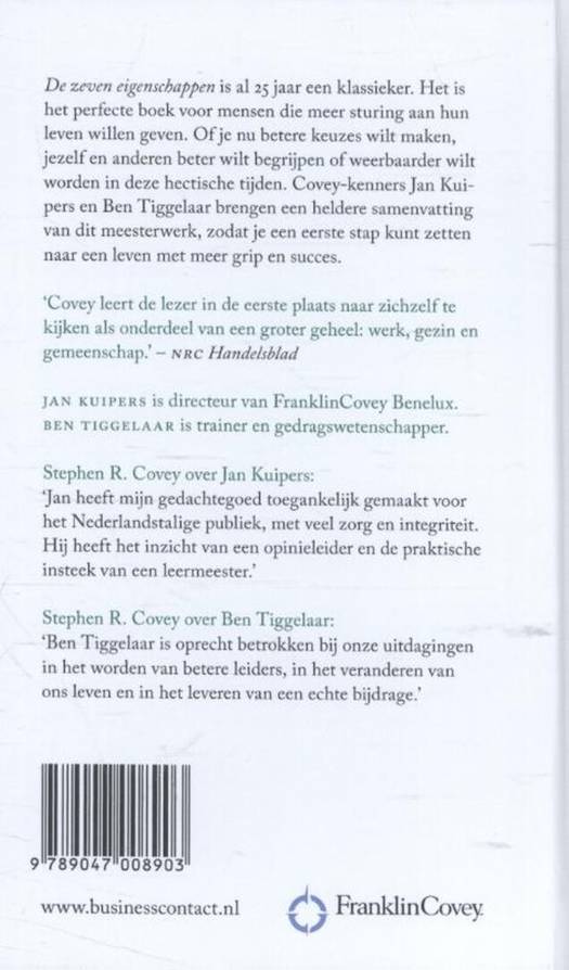 De zeven eigenschappen is al 25 jaar een klassieker. Het is het perfecte boek voor mensen die meer sturing aan hun leven willen geven. Of je nu betere keuzes wilt maken, jezelf en anderen beter wilt begrijpen of weerbaarder wilt worden in deze hectische tijden. Covey-kenners Jan Kuipers en Ben Tiggelaar brengen een heldere samenvatting van dit meesterwerk, zodat je een eerste stap kunt zetten naar een leven met meer grip en succes.